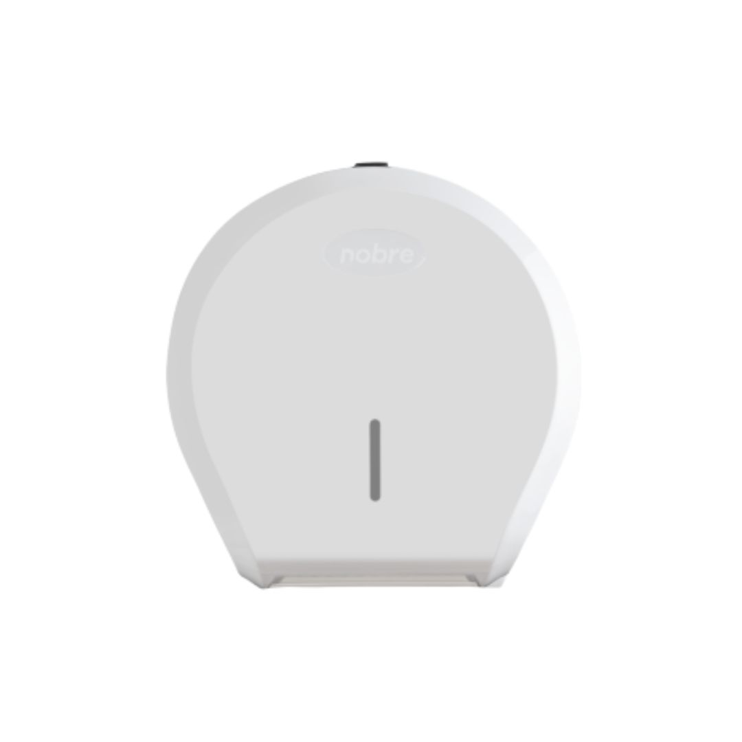 Dispenser para papel higiênico rolão Compatível com rolos de 300 a 500 metros Linha: new Classic Frente branca Base cinza